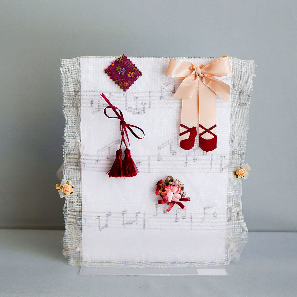 Στατό από plexi glass επενδεδυμένο με γάζα, ζωγραφισμένη στο χέρι με πεντάγραμμο και νότες, στολισμένη με vintage μπαλαρινέ ρομαντικά στοιχεία.