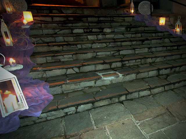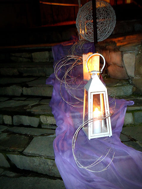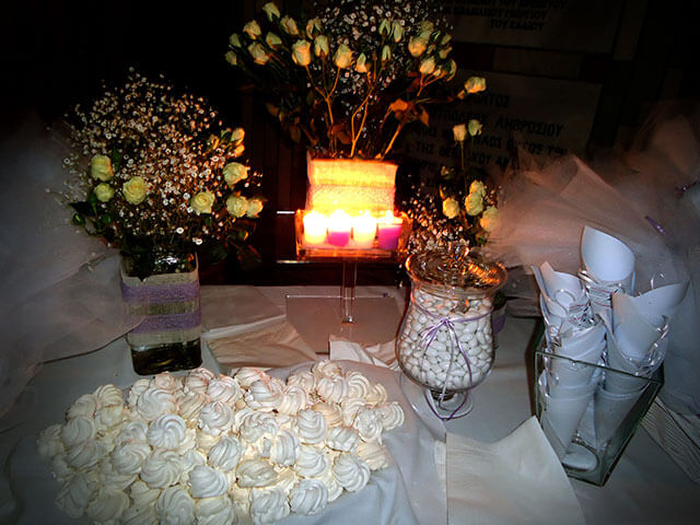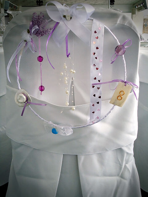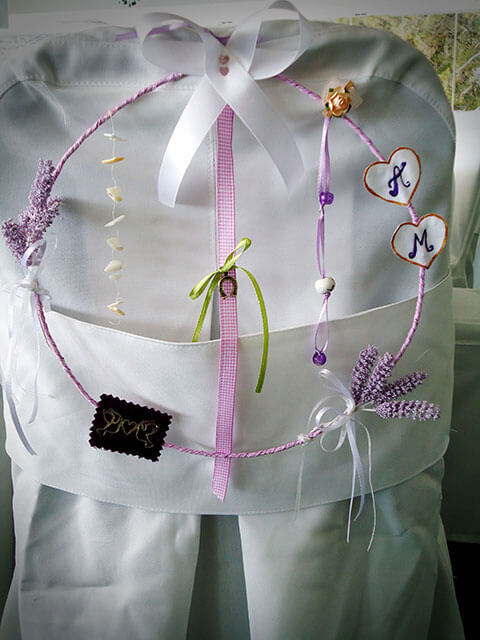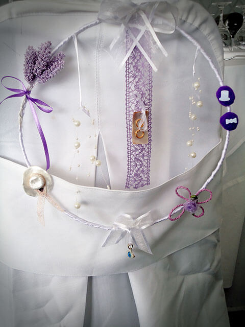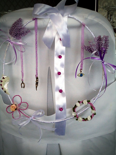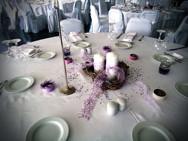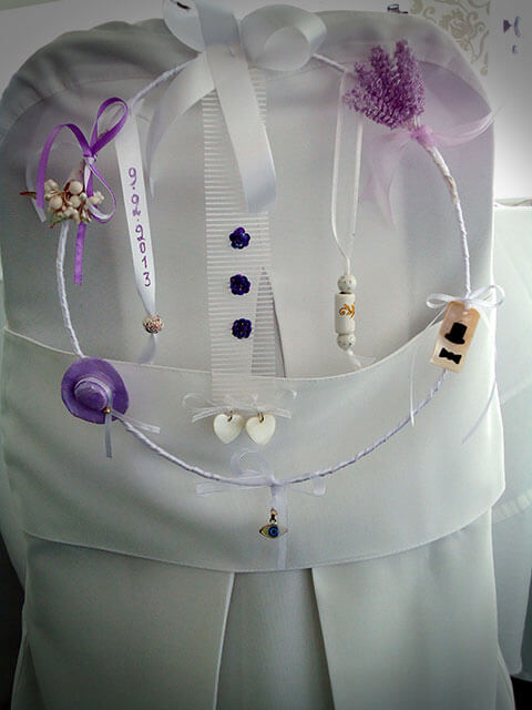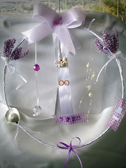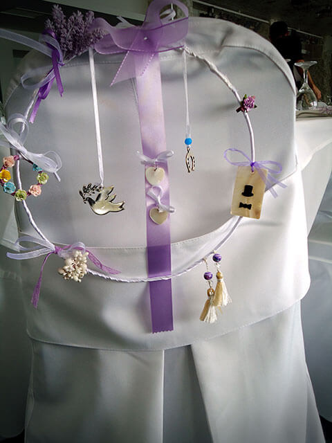 Στεφάνι καρδιά με αποξηραμένα μωβ λουλουδάκια στο κέντρο του τραπεζιού με κεριά και κορδέλες φτιαγμένες από οργαντίνα, με ενσωματωμένες και μπερδεμένες κλωστές μεταξύ τους σε αποχρώσεις λεβάντα και λευκό. Οι θήκες από ρεσό με φυσική αποξηραμένη λεβάντα δινουν ένα υπέροχο άρωμα κατα τη διάρκεια του γεύματος, όπως επίσης και οι μωβ πετρούλες. Οι χειροποίητοι κρίκοι στολίζουν το πίσω μέρος από τις καρέκλες στο τραπέζι των νεονύμφων για να ξεχωρίζει από τα υπόλοιπα.