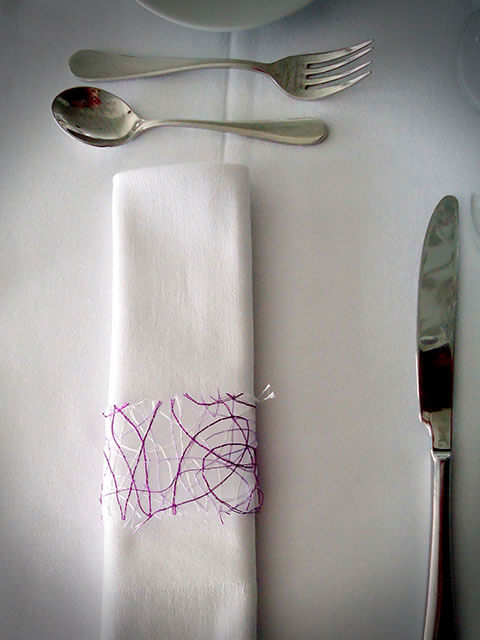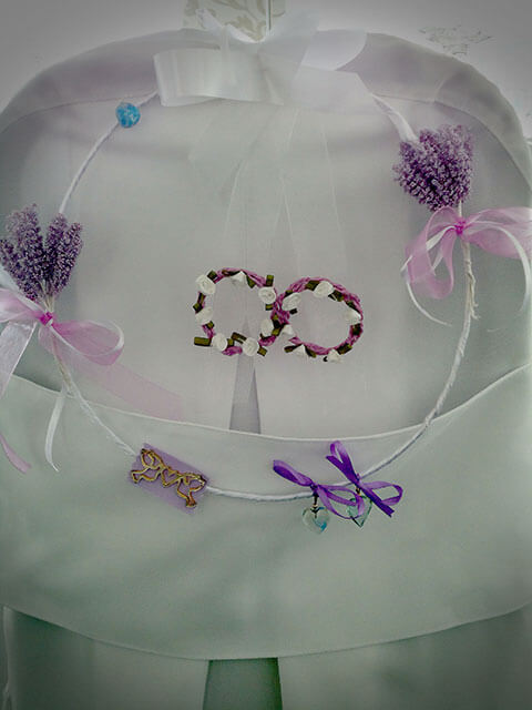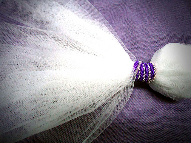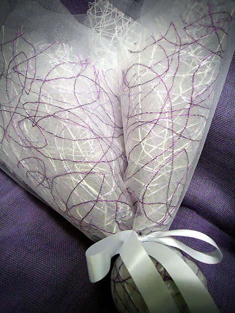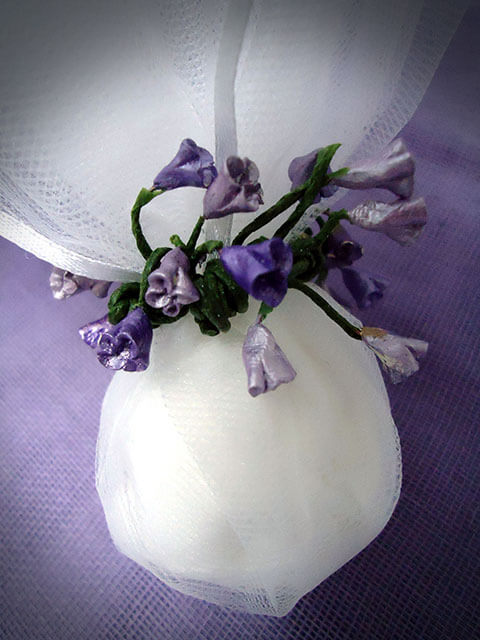 Με ενσωματωμένες κλωστές σε αποχρώσεις λεβάντα και λευκό, δεμένες με λευκή, σατέν κορδέλα.
