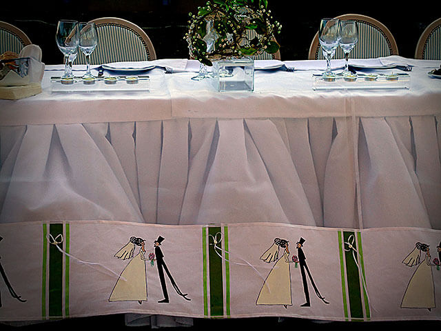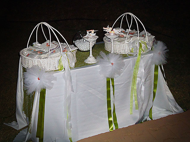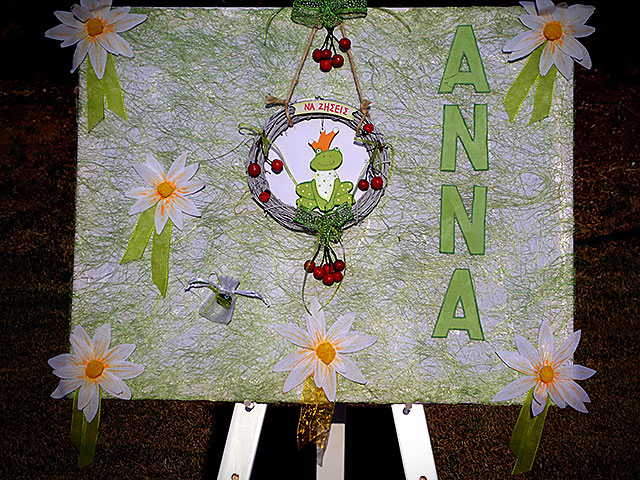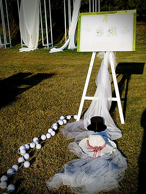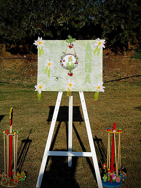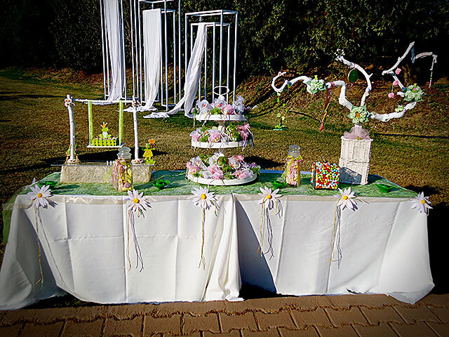 Στο νυφικό τραπέζι λευκό τραπεζομάντηλο με μπορντούρα 10m ζωγραφισμένη στο χέρι με θέμα τον γαμπρό και την νύφη και συνδυασμός από σατέν και οργαντέ κορδέλες σε πράσινο ανοιχτό χρώμα με λευκά άσπρα σατέν φιογκάκια. Στο κέντρο του τραπεζιού διπλό στεφάνι από χειροποίητα πήλινα μιγκέ. Στο τραπέζι για τις μπομπονιέρες των ενηλίκων λευκά καλάθια στολισμένα με λευκές κορδέλες. Στο λευκό λινό τραπεζομάντηλο τούλινα λευκά πον-πον πάνω από φαρδιές σατέν κορδέλες σε πράσινο ανοιχτό χρώμα. Στο παιδικό τραπέζι με θέμα το βάτραχο ράννερ από πράσινο χόρτο πάνω σε λευκό λινό τραπεζομάντηλο και χειροποίητες πάνινες μαργαρίτες. Χειροποίητη κούνια από λευκό ξύλο και λευκό δεντράκι μέσα σε λευκό καλάθι με διάφορα βατραχάκια και ρομαντικά κοριτσίστικα θέματα. Στο χώρο ταμπλό ζωγραφισμένα στο χέρι με τα αρχικά του ζευγαριού, τρυγόνια και τεχνική κολλάζ για το όνομα της μικρής με διάφορα χειροποίητα πάνινα και ξύλινα στοιχεία.