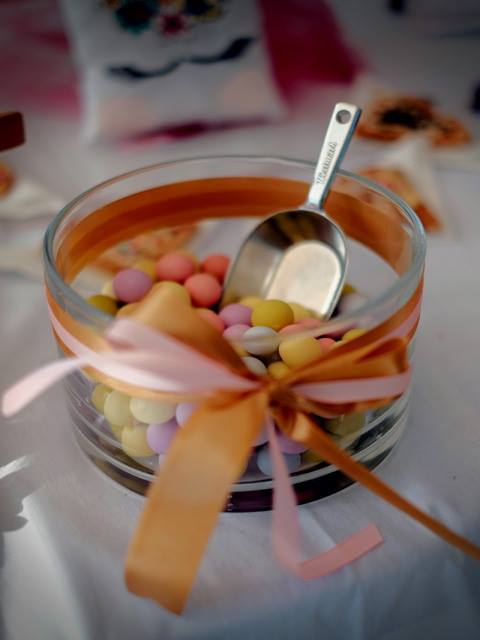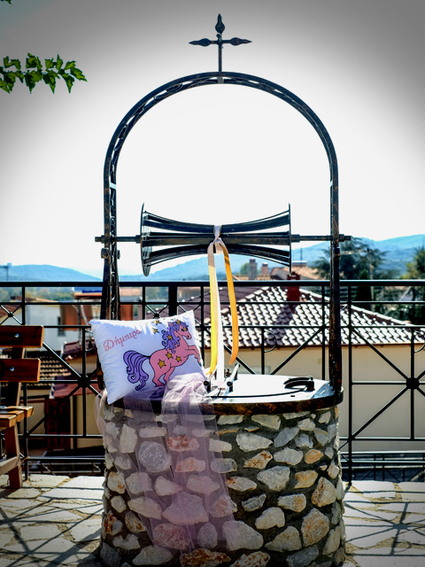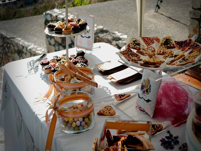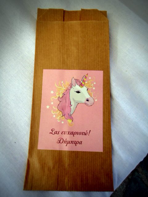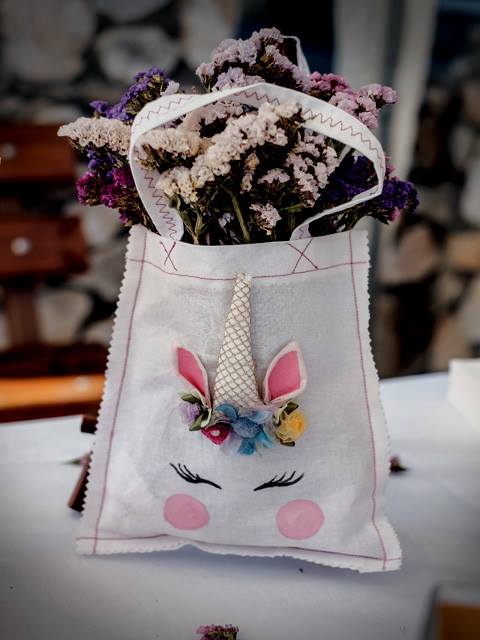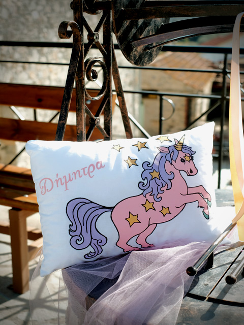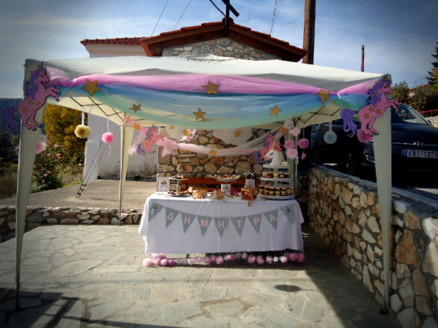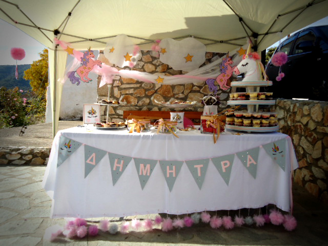 Στις αρχές του ηλιόλουστου Νοέμβρη έγινε η βάπτιση της μικρής Δήμητρας στην όμορφη πέτρινη εκκλησία στον Αγ. Ανδρέα Καβάλας.Θέμα της ο ονειρικός μονόκερος. Έτσι ζωγράφισα τέσσερις υπέροχους μονόκερους σκαρφαλωμένους πάνω στις άκρες της τέντας,με τους δύο από αυτούς να ξεπηδούν μέσα από ένα τούλινο ουράνιο τόξο και τους άλλους δύο στο πίσω μέρος από συννεφάκια. Τα αστέρια ήταν σκορπισμένα στο ουράνιο τόξο και στα σύννεφα. Στα πλαϊνά της τέντας έβαλα μεγάλα αιθέρια τούλινα πον-πον σε αποχρώσεις ροζ,λιλά,γκρι-ασημί. Το κάλυμμα του τραπεζιού τελείωνε με πολλά μικρά στις αποχρώσεις του ροζ τούλινα πον-πον και μικρά σημαιάκια με το όνομα της μικρής. Σαν σε παρένθεση το όνομα άρχιζε και τελείωνε με ζωγραφισμένους μονόκερους. Στην κορυφή του τριόροφου δίσκου με τα γλυκά έστησα έναν τρισδιάστατο τρυφερό μονόκερο. Τα λουλούδια τοποθετήθηκαν στην χειροποίητη τσάντα που έφτιαξα με το ίδιο θέμα. Δύο ακόμα προτάσεις μονόκερου στόλιζαν το τραπέζι υπό μορφή κάδρου. Τα υπόλοιπα καλούδια μπήκαν σε γυάλες και δίσκους και προσφέρονταν στα χάρτινα κραφτ σακουλάκια που έφεραν αυτοκόλλητα με το θέμα της βάπτισης και τις ευχαριστίες της μικρής. Από εκείνη την ημέρα, ο μικρός μονόκερος θα βρίσκεται στο δωμάτιο της στο μαξιλάρι που ζωγράφισα με το όνομά της.