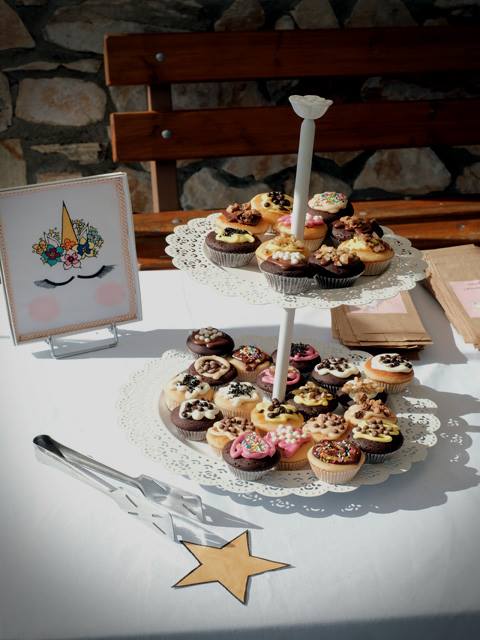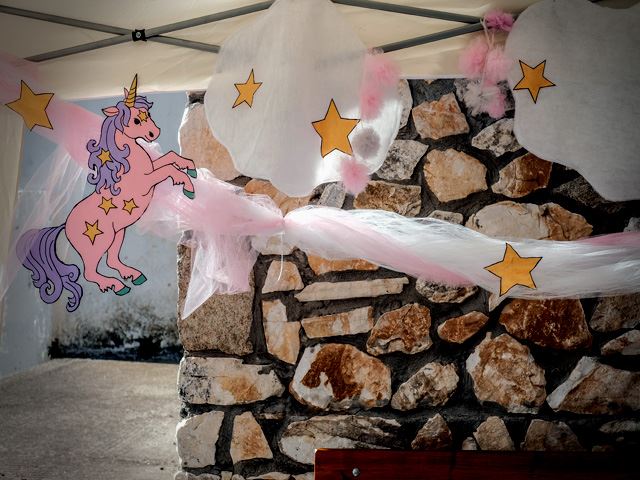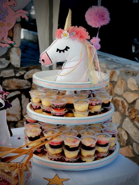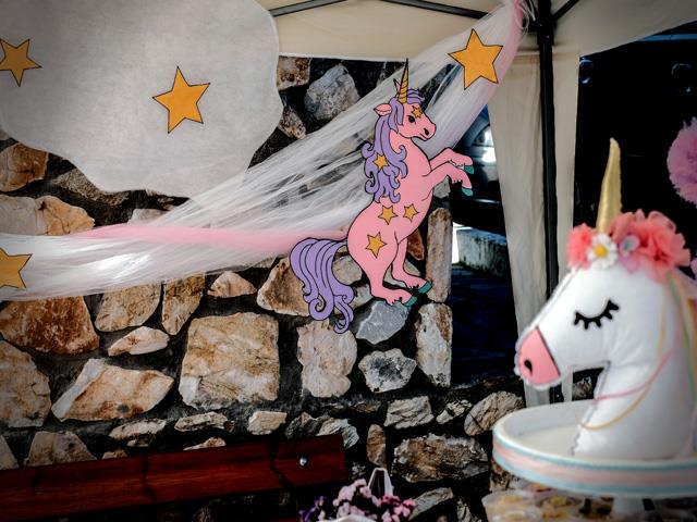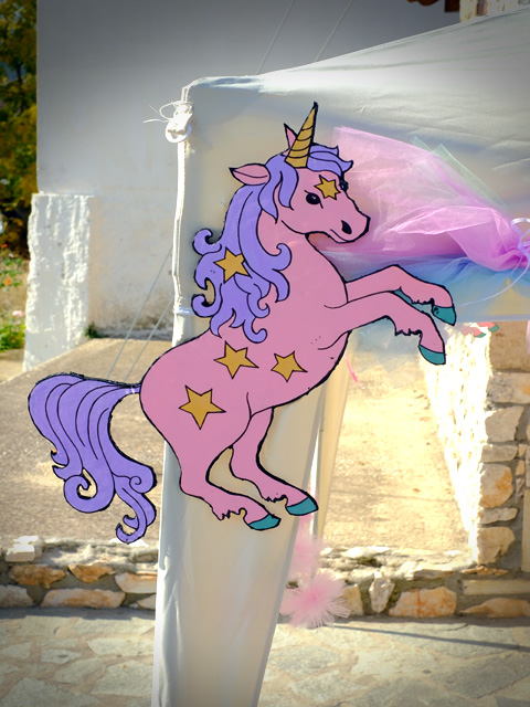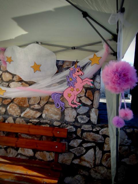 Το θέμα και η επιθυμία ήταν της μαμάς. Συζητήσαμε και αποφασίσαμε να δοθεί ρομαντική,ονειρική ατμόσφαιρα σε όλο το concept. Με αυτό το δεδομένο, με τον καθορισμό των χρωματικών αποχρώσεων που θα κυριαρχούσαν και με την διαβεβαίωση της απόλυτης εμπιστοσύνης στην δουλειά μου, ξεκίνησα. Καταπιάστηκα με την ζωγραφική των τεσσάρων μονόκερων, την δημιουργία των πον-πον, των αστεριών και όλων των διακοσμητικών στοιχείων. Το αποτέλεσμα ενθουσίασε την μαμά και τους καλεσμένους και με γέμισε με μία ακόμα ευχάριστη εμπειρία.