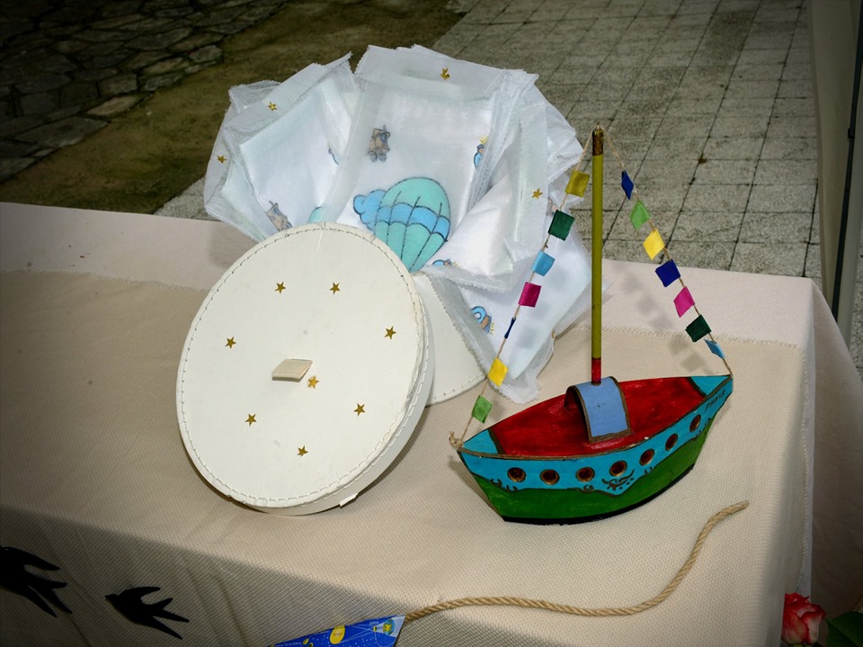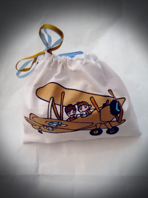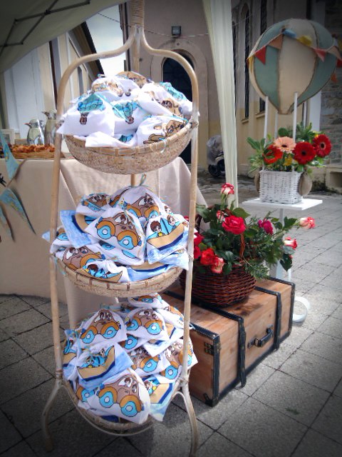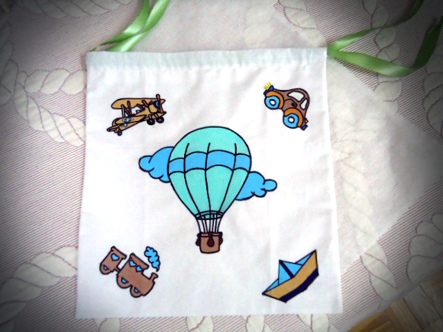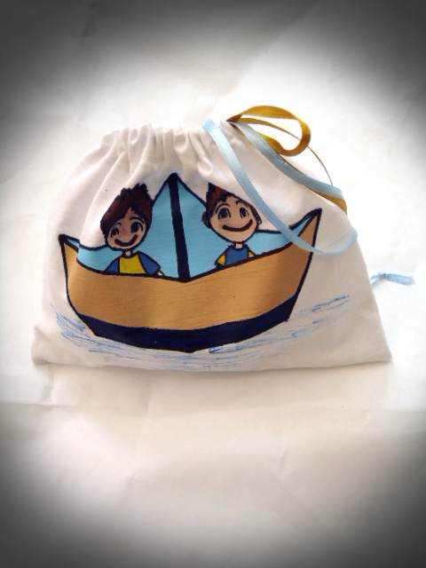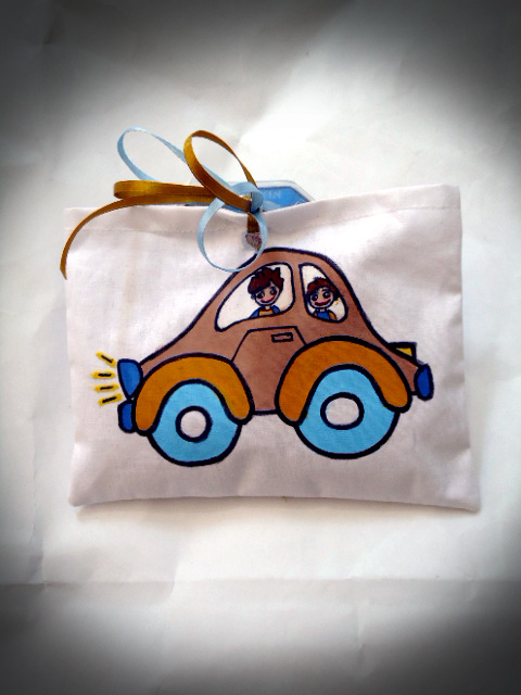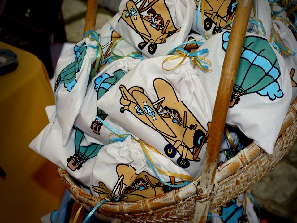 Χειροποίητα πάνινα ζωγραφιστά πουγκάκια με τους μικρούς ταξιδευτές σε διάφορα μέσα μεταφοράς μιας άλλης εποχής..Τα δώρα για τους μικρούς προσκεκλημένους ήταν πάνινες ζωγραφιστές τσάντες αποθήκευσης με το θέμα της βάπτισης.