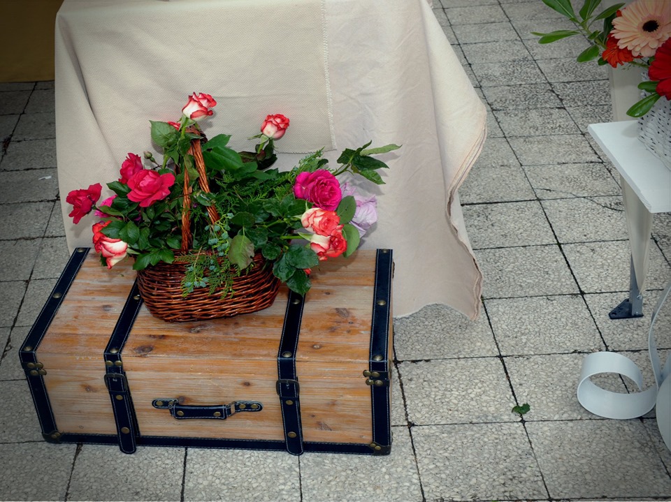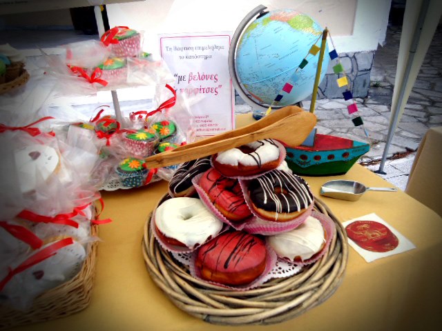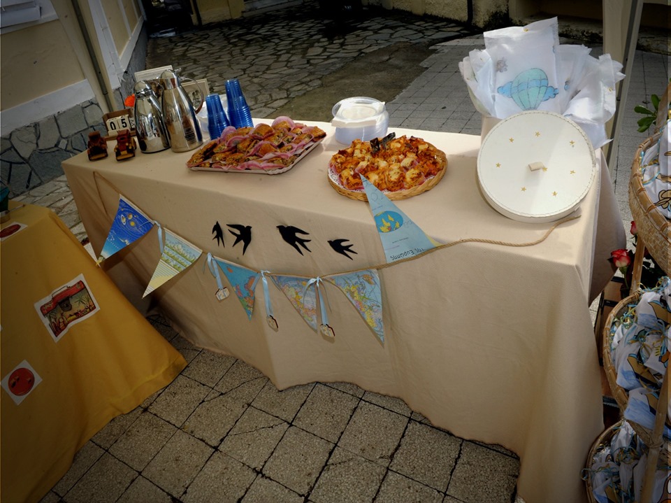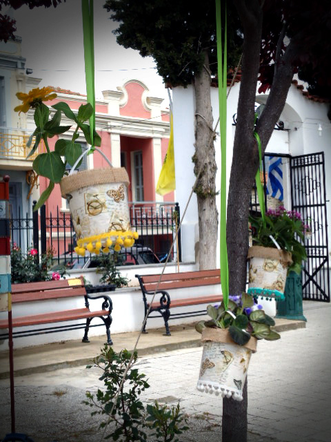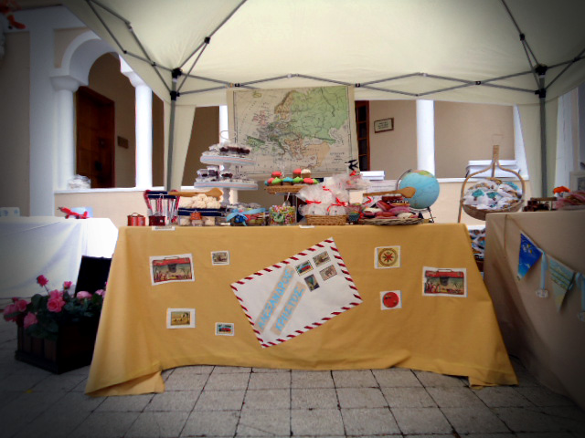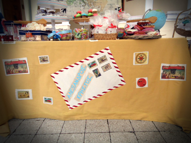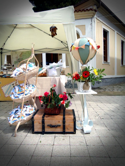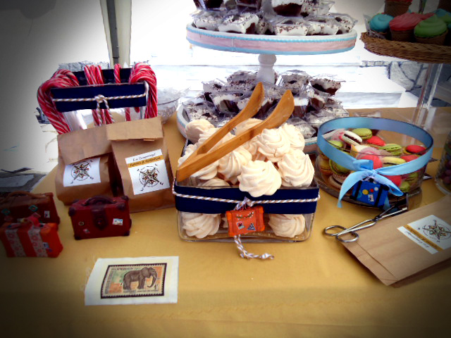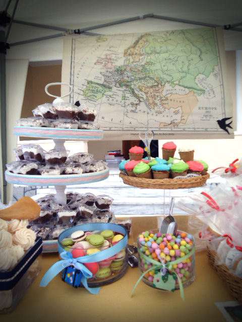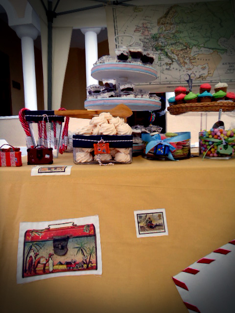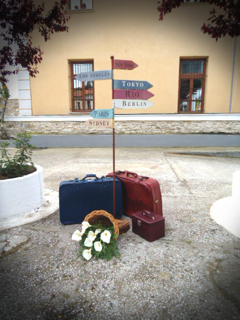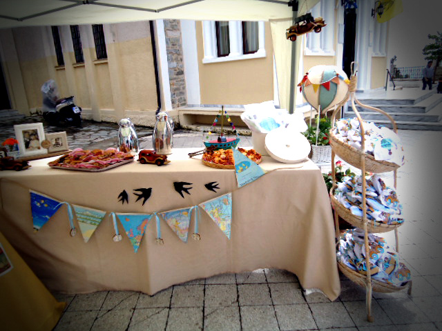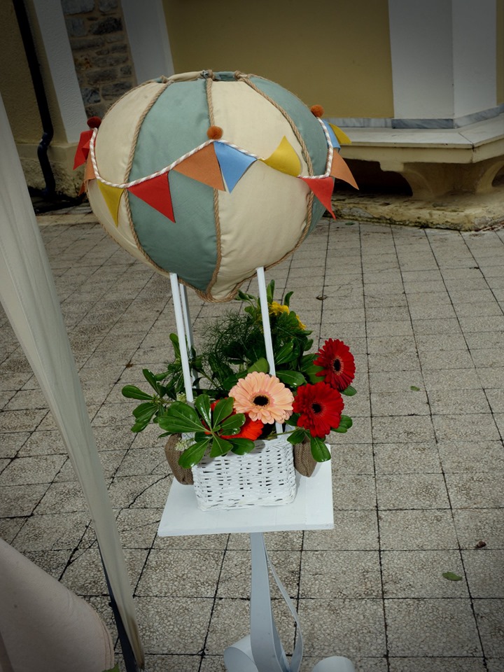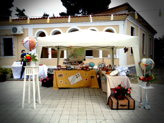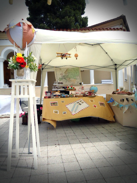 Σε μία εντελώς ανοιξιάτικη ατμόσφαιρα τα πάντα υπογραμμίστηκαν με πολλά λουλούδια.Λουλούδια στα δύο μεγάλα χειροποίητα αερόστατα,λουλούδια σε καλάθια και κοφίνια,λουλούδια κρεμασμένα σε vintage κουβαδάκια σε δέντρα και κάγκελα.Προορισμός?Τον έδειχνε ο δείκτης με όλες τις μεγάλες πόλεις του κόσμου ενώ γύρω του οι βαλίτσες ήταν έτοιμες για εκκίνηση.Τα δύο τραπέζια γεμάτα με καλούδια υπογράμμιζαν τους προορισμούς με τα πολλά μικρά βαλιτσάκια εδώ και εκεί,με τα σημαιάκια φτιαγμένα από χάρτες,τα διάφορα μέσα μεταφοράς σε μικρά παιχνίδια και τέλος τον μεγάλο ταχυδρομικό φάκελο με τα ονόματα των μικρών ταξιδευτών.Ο χάρτης στο πίσω μέρος της τέντας θύμιζε τον γύρω του κόσμου.Σκόπιμα τα μικρά χελιδόνια μπήκαν για να θυμίζουν ότι το ταξίδι δεν τελειώνει ποτέ.