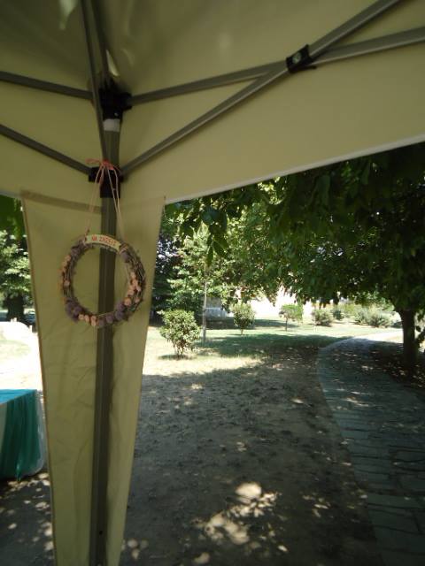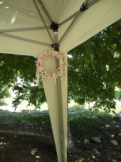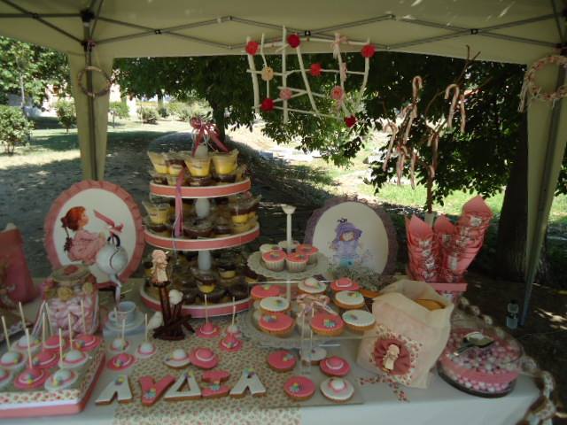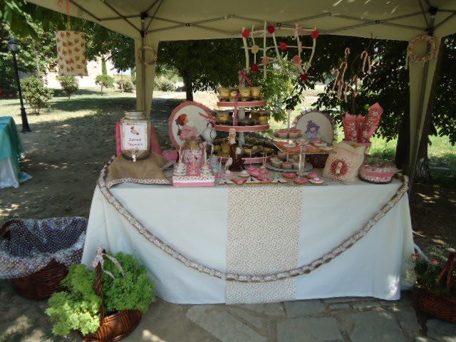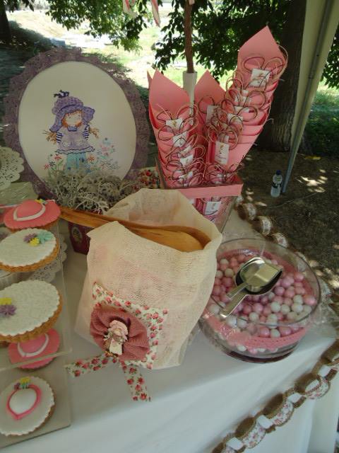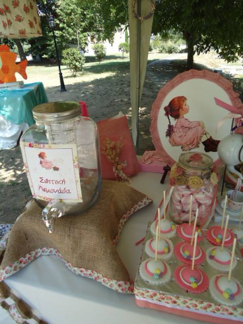Πάνω στο λευκωπό τραπεζομάντηλο στήθηκαν δύο ρομαντικά πορτρέτα της Sarah Kay, πάνινες σακούλες με το θέμα, με καλούδια, cupcakes, popcakes, κουφέτα και άλλα για να μπούνε στα χωνάκια με τη Sarah Kay. Η λεμονάδα ήταν σπιτική. Ιδιαίτερη εντύπωση έκανε το γερμένο τσαγερό που από το ρύγχος του “χίνονται” κορδέλες στο φλυτζανάκι. Το τραπέζι περιβάλονταν από γιρλάντα φτιαγμένη από λινάτσα και ύφασμα. Στις γωνιές της τέντας στεφάνια και ξύλινη κατασκευή με λουλούδια, ενώ στο μπροστινό μέρος της, σημαιάκια με το όνομα της μικρής και υφασμάτινες κουίντες.