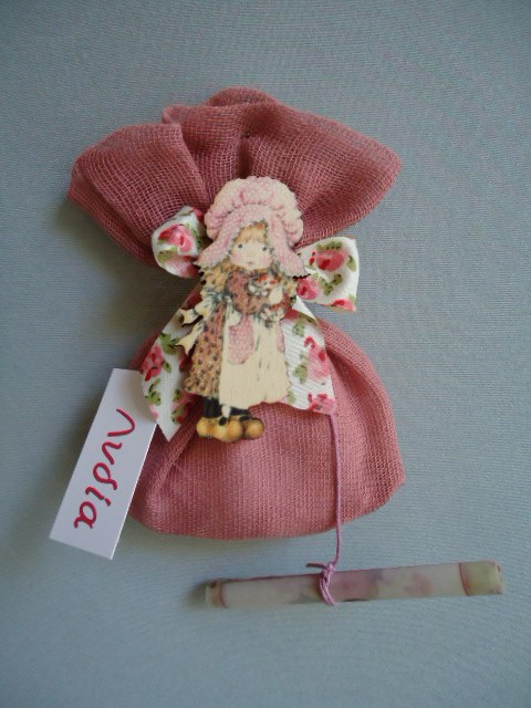 Οι μπομπονιέρες-προσκλητήριο ήταν από κολλαρισμένη γάζα χρώματος σάπιου μήλου και ξύλινη απεικόνιση της Sarah Kay
