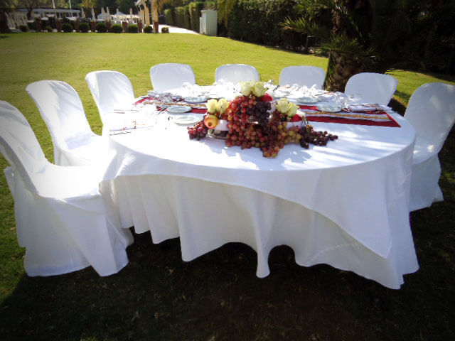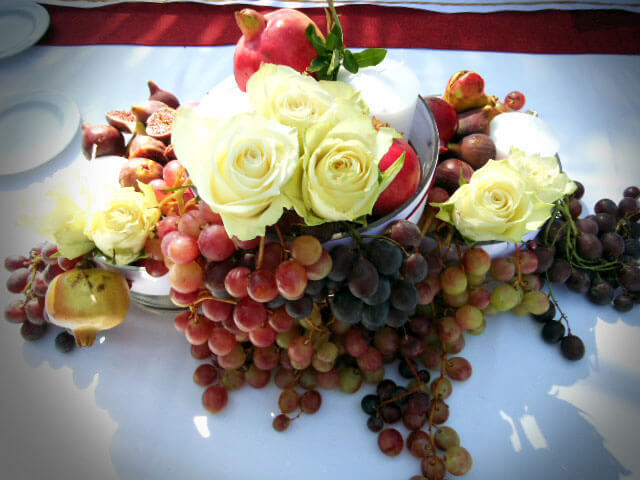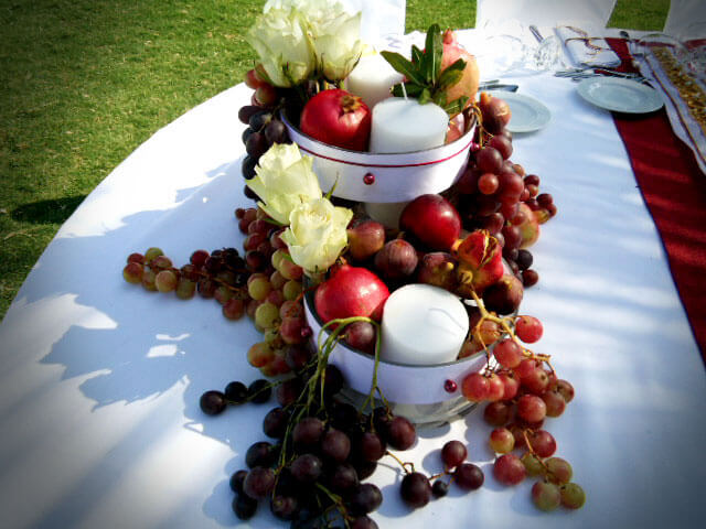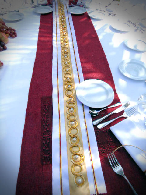 Τρεις καθιστές γυάλες διακοσμημένες εξωτερικά με λευκές κορδέλες και μπορντώ πέρλες, στολισμένες με φρέσκα φρούτα, λουλούδια και κεριά. Σε λευκό τραπεζομάντηλο, μπορντώ runner με λευκό σατέν, διακοσμημένο με χρυσό και πέρλα.