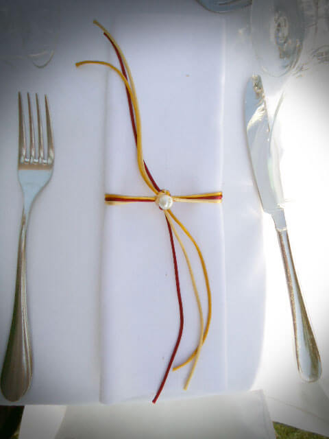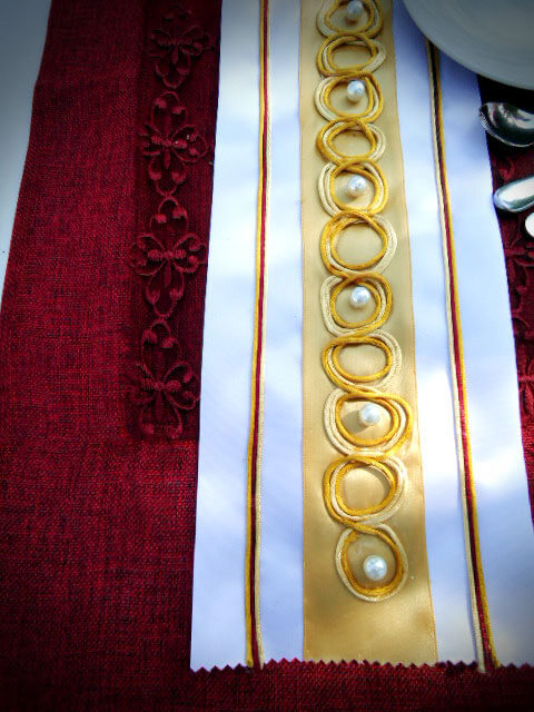 Στέκα ντυμένη με ivory γκρο κορδέλα. Τριανταφυλλάκια από ivory και μπορντώ γκρο κορδέλα με λευκή πέρλα στο κέντρο με δαντέλα πάνω σε τούλι ως πεπλάκι.