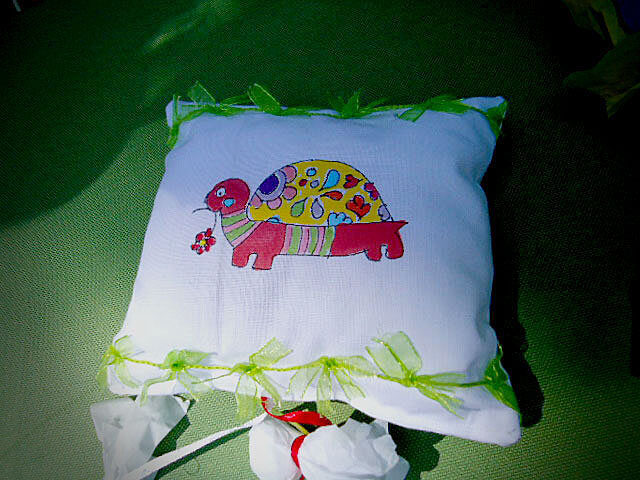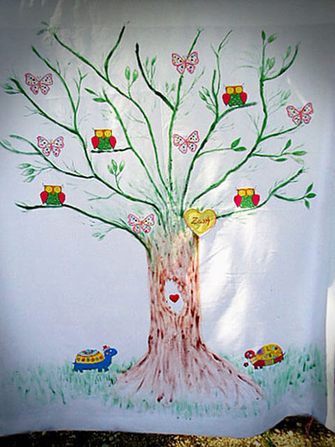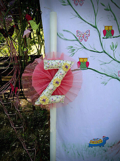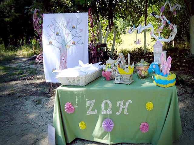 Ανοιχτό πράσινο καραβόπανο για τραπεζομάντηλο με απλικαρισμενο το όνομα του παιδιού και ροζέτες από γάζα σε διάφορα χρώματα. Λευκό δέντρο μπηγμένο μέσα σε άσπρο καλάθι με διάφορα στοιχεία του δάσους. Χειροποίητη χελώνα από papier mache και πανί για τα χωνάκια για τα γλυκίσματα. Στο πίσω μέρος του τραπεζιού πανό ζωγραφισμένο στο χέρι εμπνευσμένο από το δέντρο της ζωής και κλαδιά με πάνινες πεταλούδες. Λαμπάδα με το μονόγραμμα της μικρής.